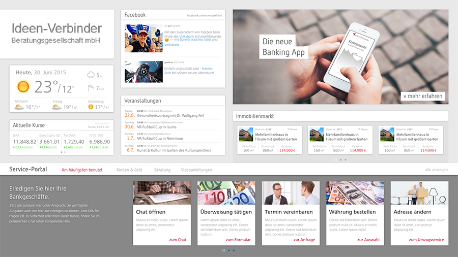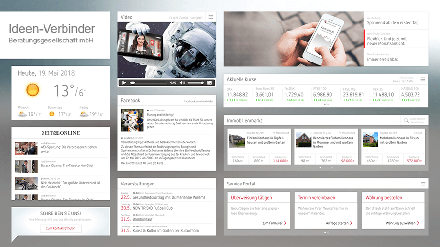 "Nebenbei" - vielleicht mit einem Kaffeebecher in der Hand - können hier aktuelle Informationen zur Verfügung gestellt werden. Aktuelle Veröffentlichungen aus dem Intranet, Inhalte aus den Sozialen Netzwerken, Veranstaltungen, Mitarbeiter-Informationen, Informationen zu aktuellen Projekten...